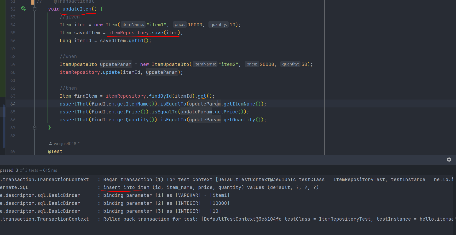 테스트에서 UPDATE SQL을 확인하려면 @Commit 을 붙이면 확인할 수 있다.