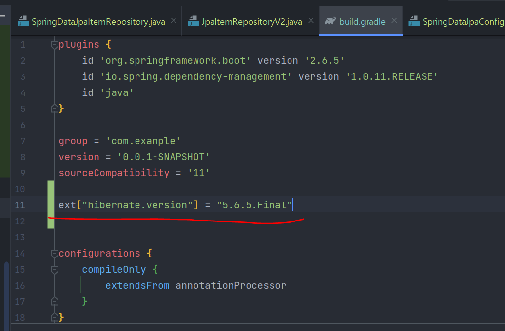 build.gradle에 다음을 추가해서 하이버네이트 버전을 문제가 없는 5.6.5.Final 로 맞추자.