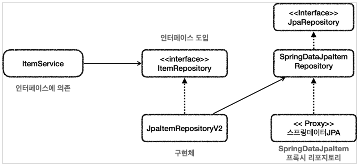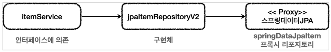 itemService는 itemrepository 인터페이스를 의존 ( 구현체는 JpaItemRepositoryV2 )