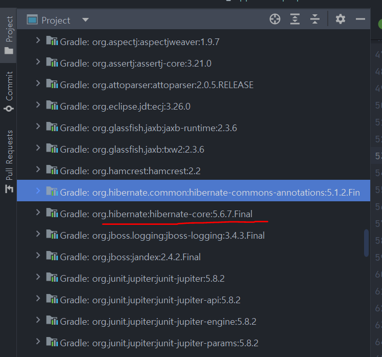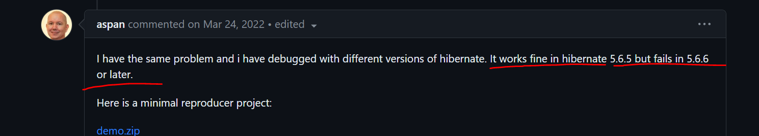 스프링 부트 2.6.5 버전은 문제가 되는 하이버네이트 5.6.7을 사용한다.
