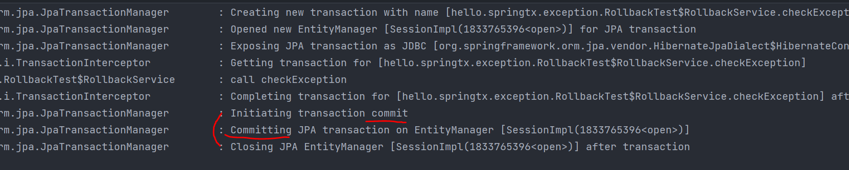체크 예외인 Exception 과 그 하위 예외가 발생하면 트랜잭션을 커밋한다.
