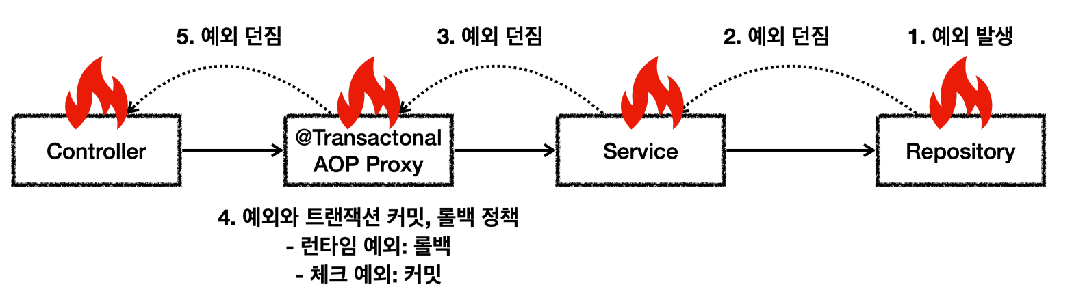 트랜잭션 범위( @Transactional가 적용된 AOP ) 밖으로 예외를 던지면 어떻게 될까?