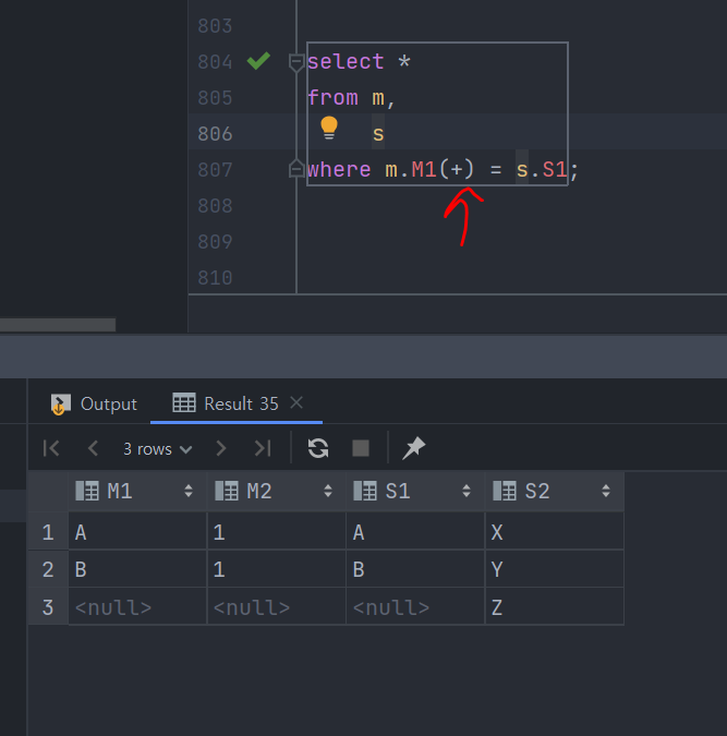 조인 조건을 ON절에서 WHERE 절로 위치가 변경되었고 조인 칼럼에 (+)이 붙어있다.