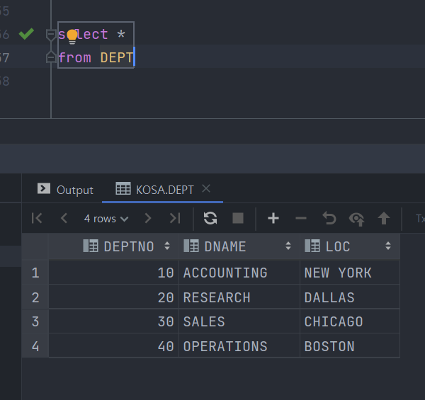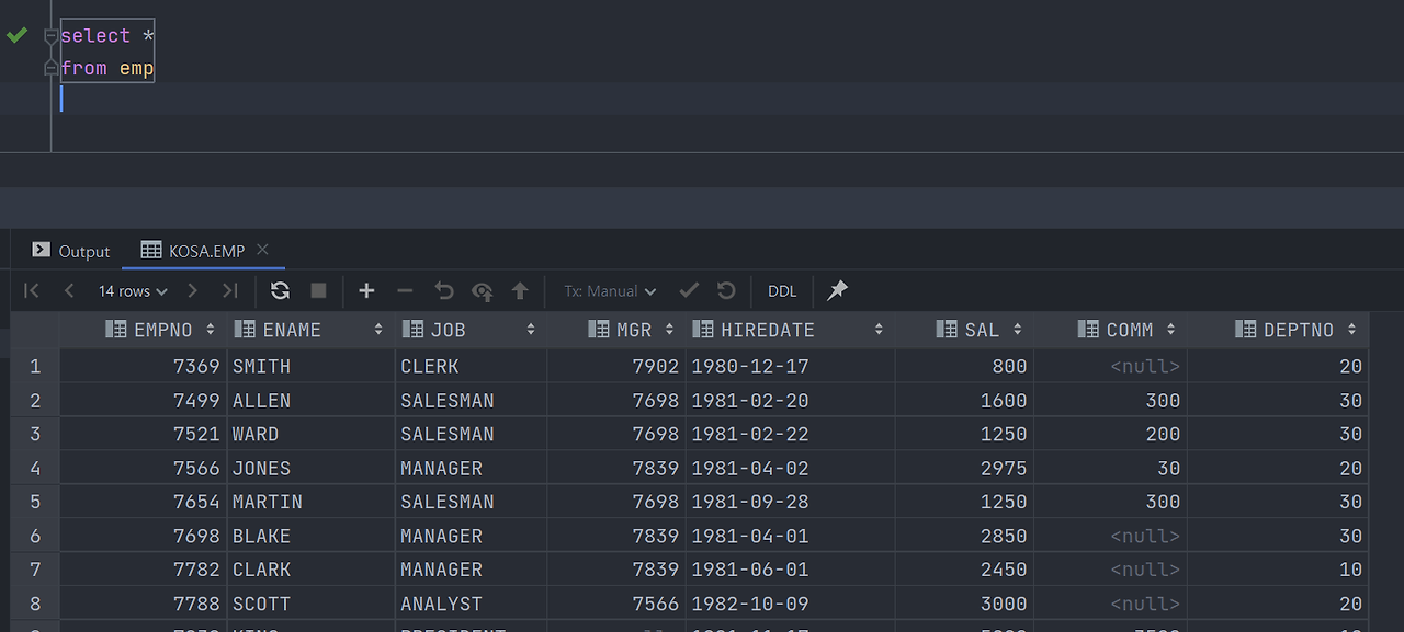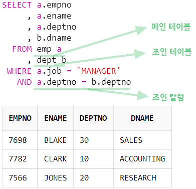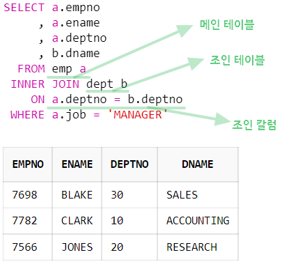 위의 예제는 EMP 테이블과 DEPT 테이블을 조인(내부 조인)하여 DEPT 테이블의 DNAME(부서명)을 조회한 쿼리이다.