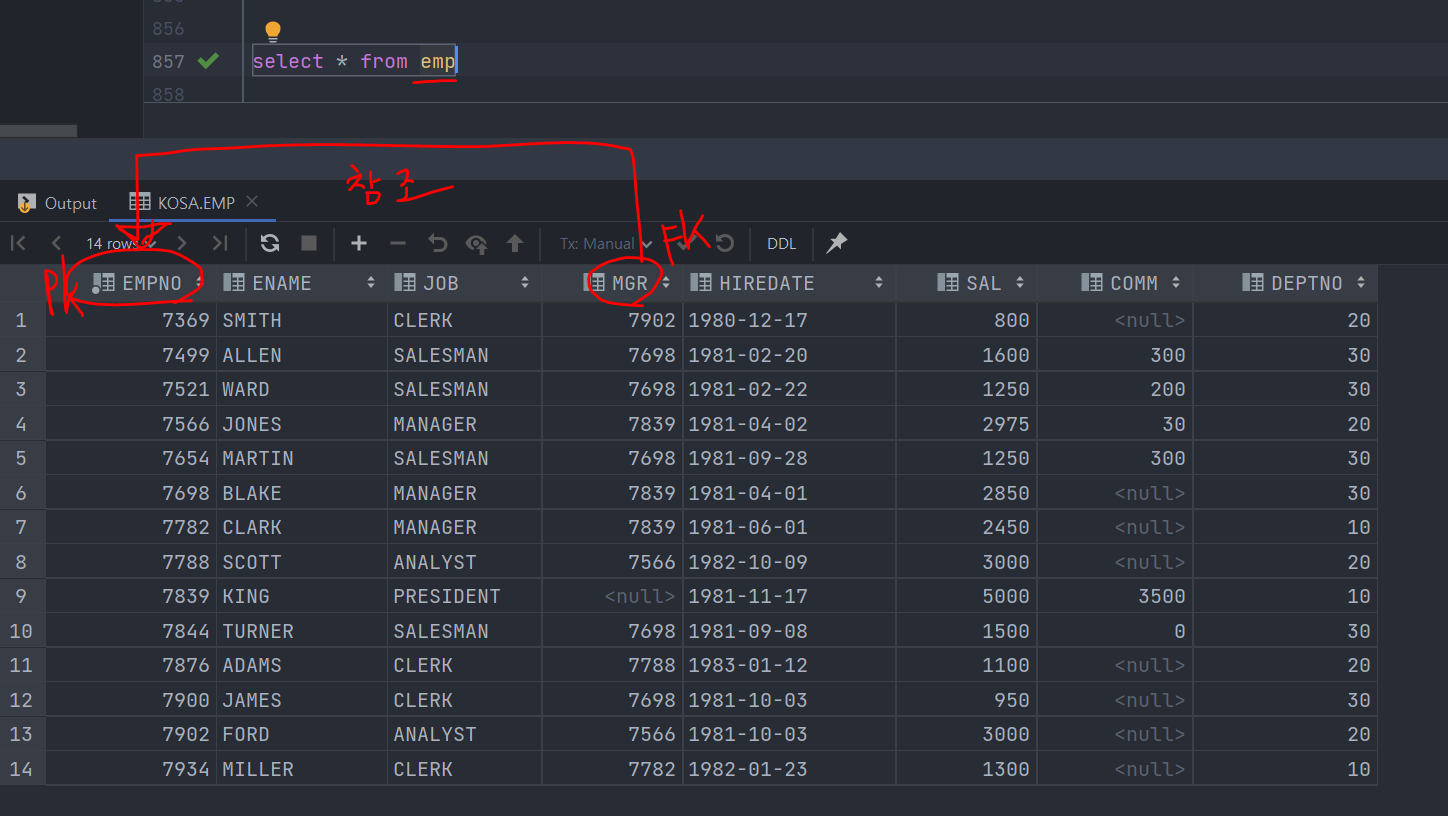 자기 참조 : 하나의 테이블에서 특정컬럼이 다른 컬럼을 참조하는 경우