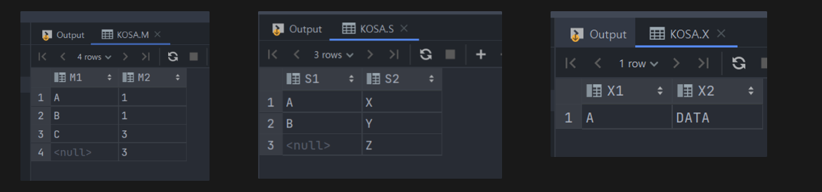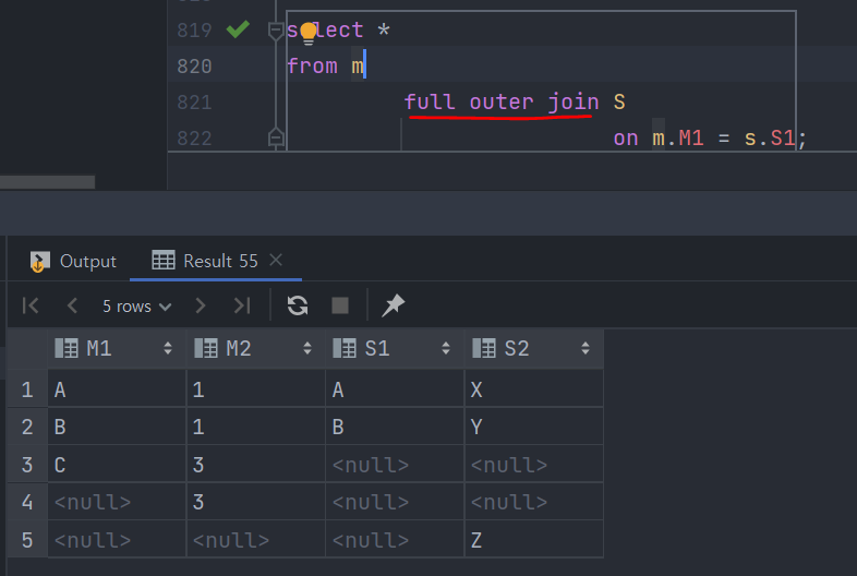 m테이블의 나머지 데이터도 넣어준다. 그 데이터가 s테이블의 컬럼값이 없을텐데 그건 null로 채워준다.