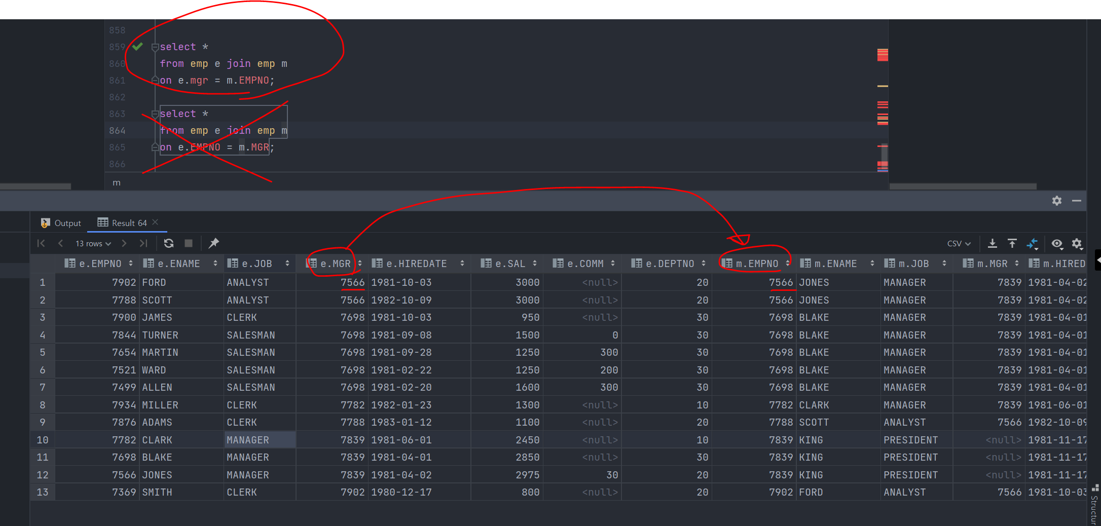 조인 조건을 e.mgr = m.empno으로 적어줘야한다.