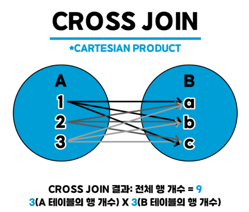 한쪽 테이블의 모든 행과 다른 쪽 테이블의 모든 행을 조인시키는 기능입니다.