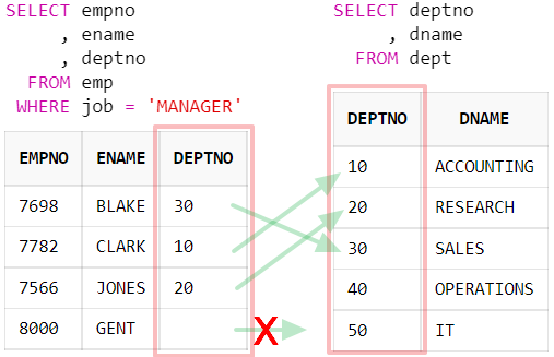 위의 조인 구조를 보면 EMP 테이블의 "GENT"는 DEPT 테이블과 조인이 안되었기 때문에 데이터 조회에서 제외된다.