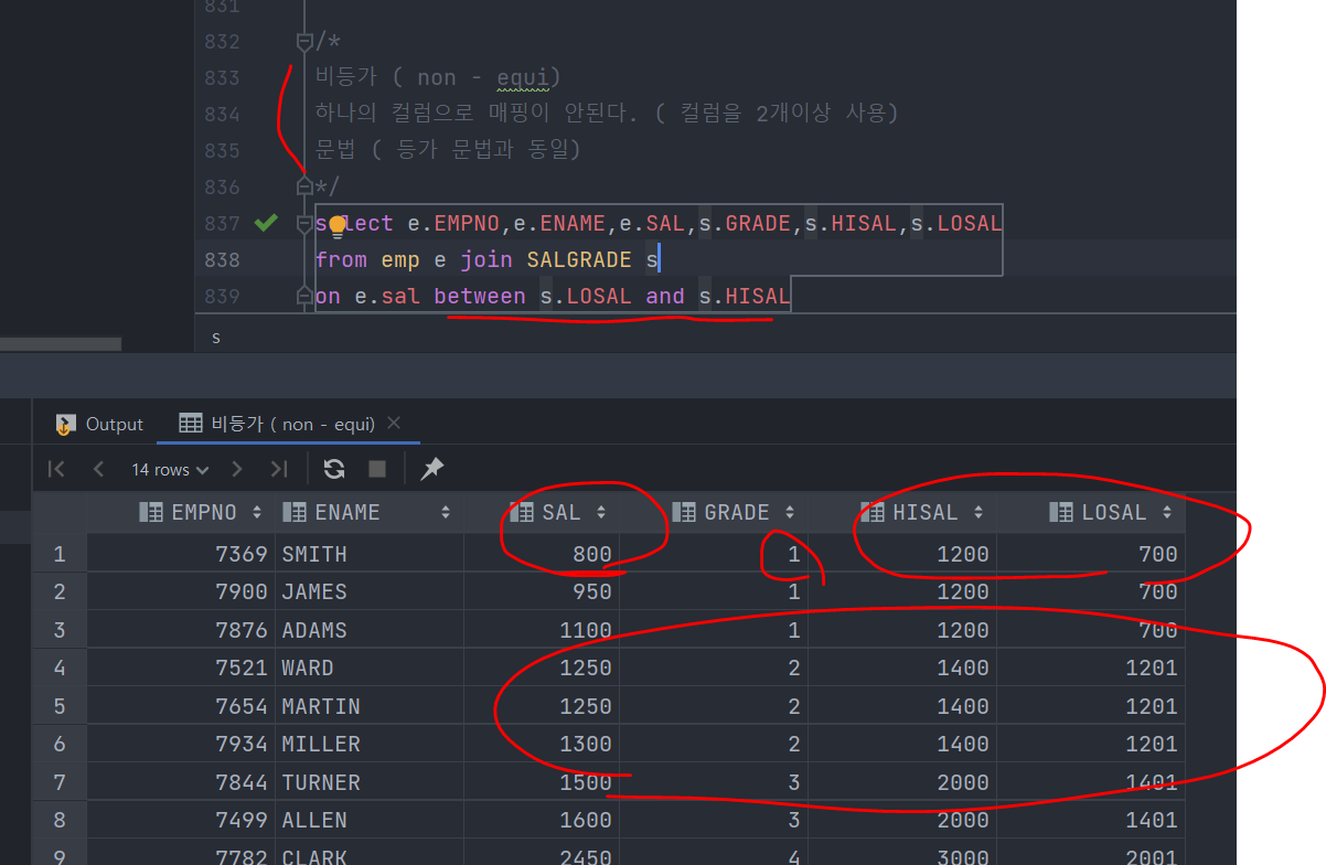 조인 대상이 되는 테이블과 대응되는 열(컬럼)이 없는 경우 범위를 지정하는 조건식으로 조인하는 방식