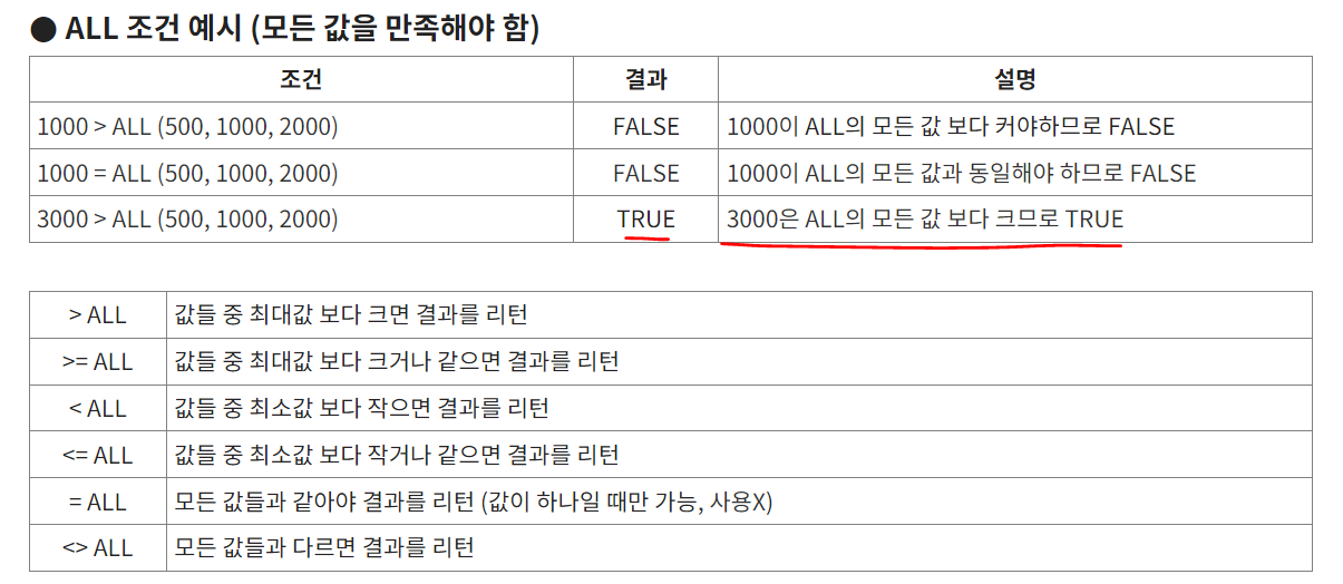 ANY(SOME), ALL은 주로 서브쿼리와 함께 사용하는 다중 행 연산자이며,