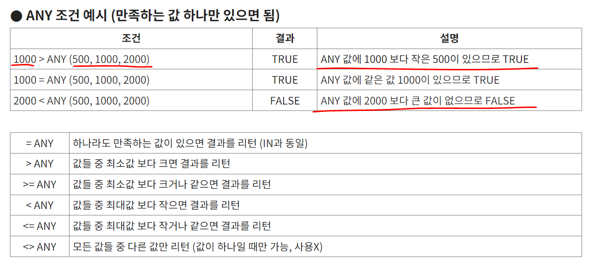ANY는 조건을 만족하는 값이 하나라도 있으면 결과를 리턴하고,