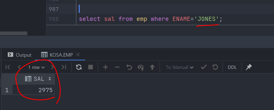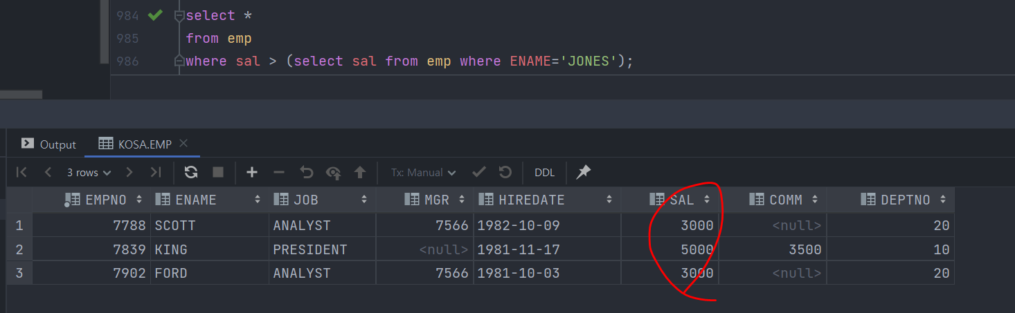 *다중 행 값이 조회되면 "ORA-01427: single-row subquery returns more than one row" 라는 오류가 발생하므로 주의