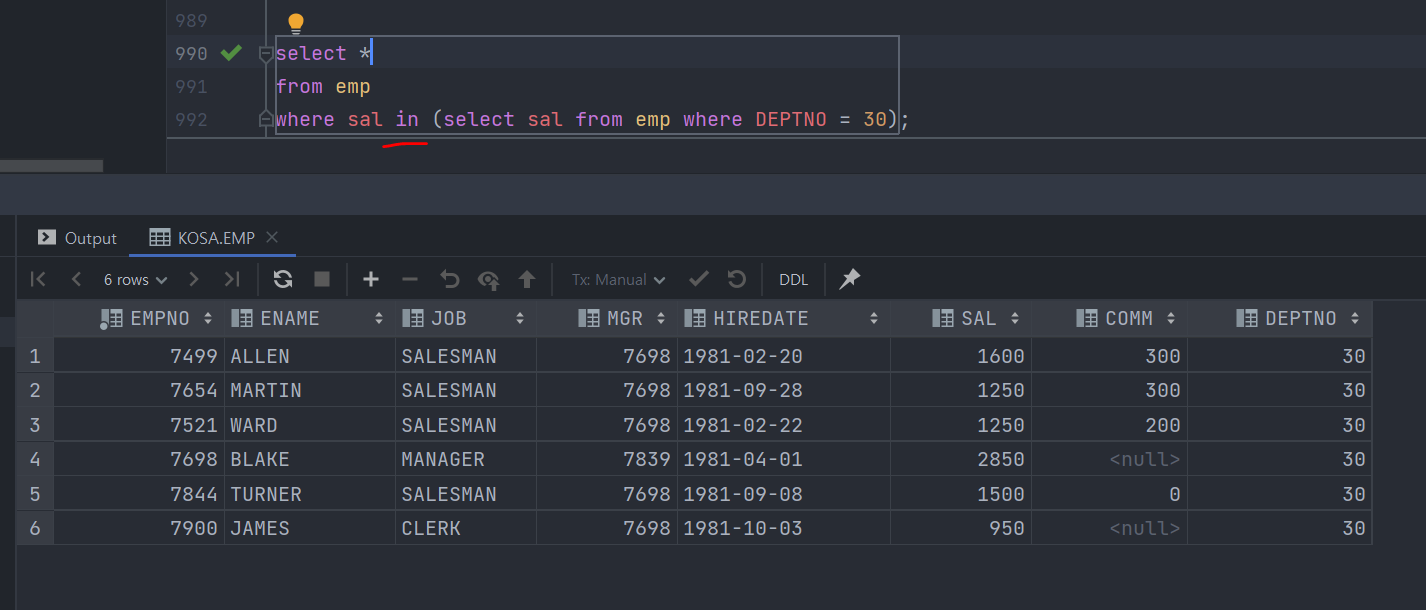 WHERE DEPTNO IN(SELECT DEPTNO -- = 이 맞는데 IN
