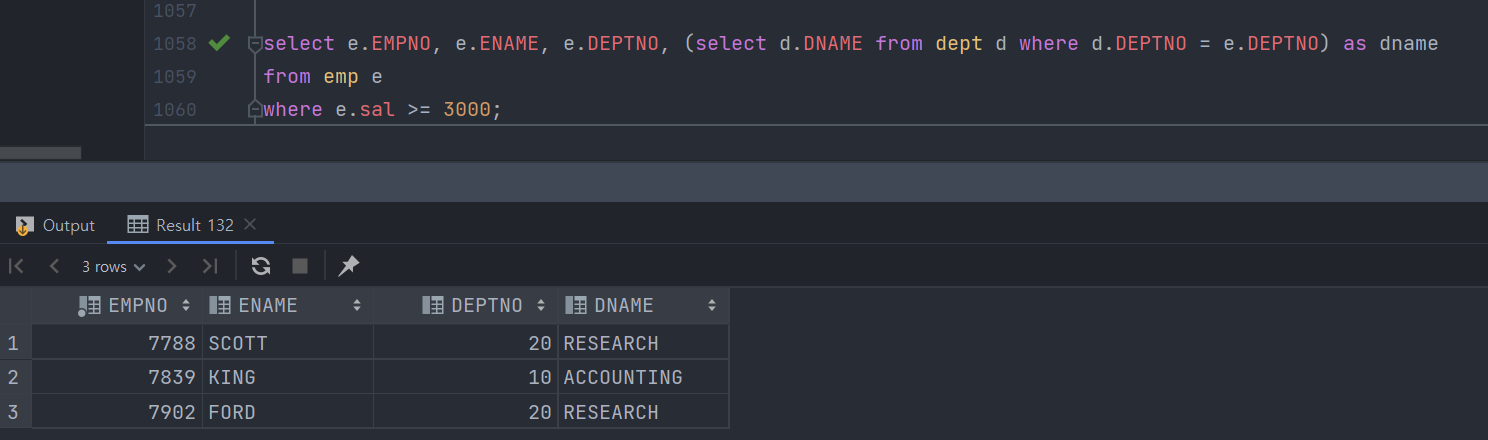 select e.EMPNO, e.ENAME, e.DEPTNO, (select d.DNAME from dept d where d.DEPTNO = e.DEPTNO) as dname