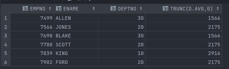 select e.EMPNO, e.ENAME, d.DEPTNO, trunc(d.avg,0)