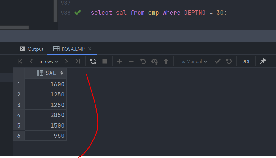 만약 ANY였다면 부서번호 30 사람들의 월급들이랑 비교 했을때 하나라도 자신이 더 컸다면 조건을 만족하게 될것이다.