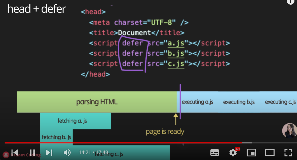 fetching이 끝나고 자바스크립트를 실행하지않고 html의 parsing까지 기다린다.
