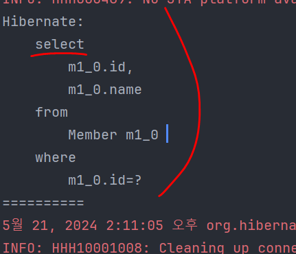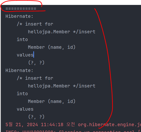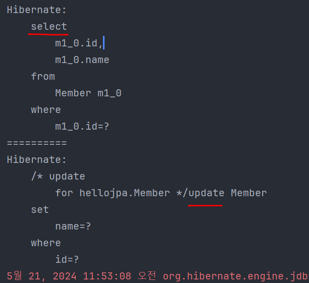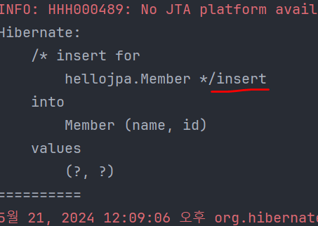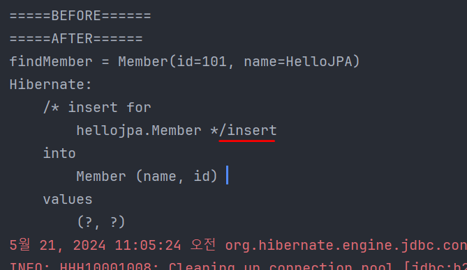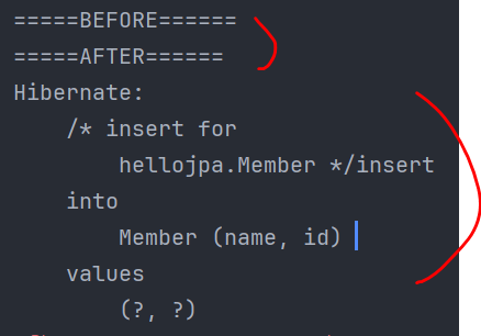 System.out.println("=====AFTER======"); // persist가 sql를 만든다면 이 로그 사이에 존재할것이다.