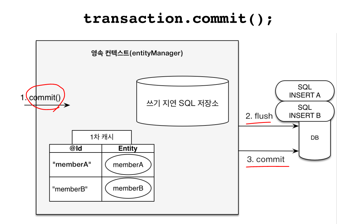 • 쓰기 지연 SQL 저장소의 쿼리를 데이터베이스에 전송 (등록, 수정, 삭제 쿼리)