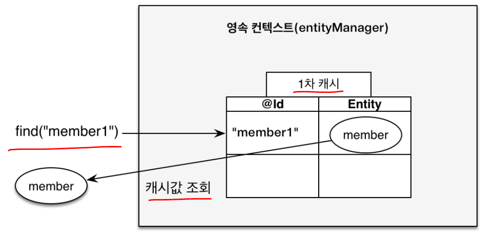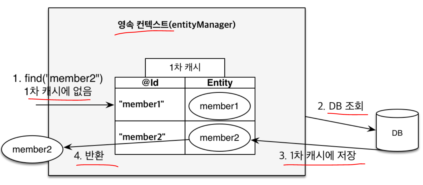이후 다시 멤버2를 조회하게 되면 1차캐시에 저장된 멤버2가 반환될것이다.