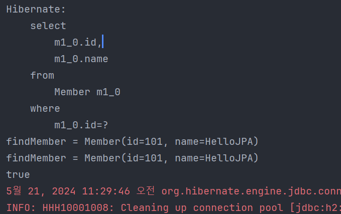 Member findMember2 = em.find(Member.class, 101L); // 위의 find 때문에 1차캐시에 해당 멤버가 저장되었으므로, select sql 문은 실행되지않는다.