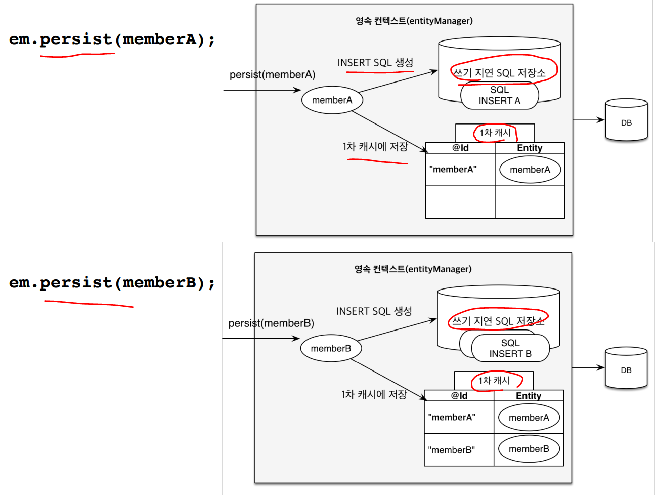 • 트랜잭션이라는 작업 단위가 중요 -> 커밋 직전에만 동기화하면 됨 [ 커밋 직전에만 SQL를 날려주면된다.]