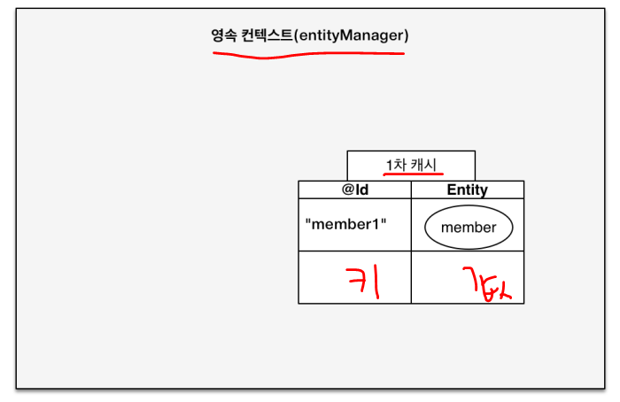 em.find를 통해 영속성컨텍스트안의 1차캐시에서 해당 멤버를 찾는다.