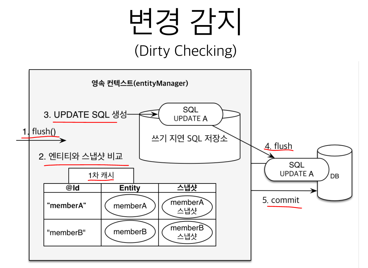 변경이 확인되면 update sql를 쓰기 지연 sql 저장소에 저장하고 다시 flush 해서 db에서 실제 sql실행 및 커밋