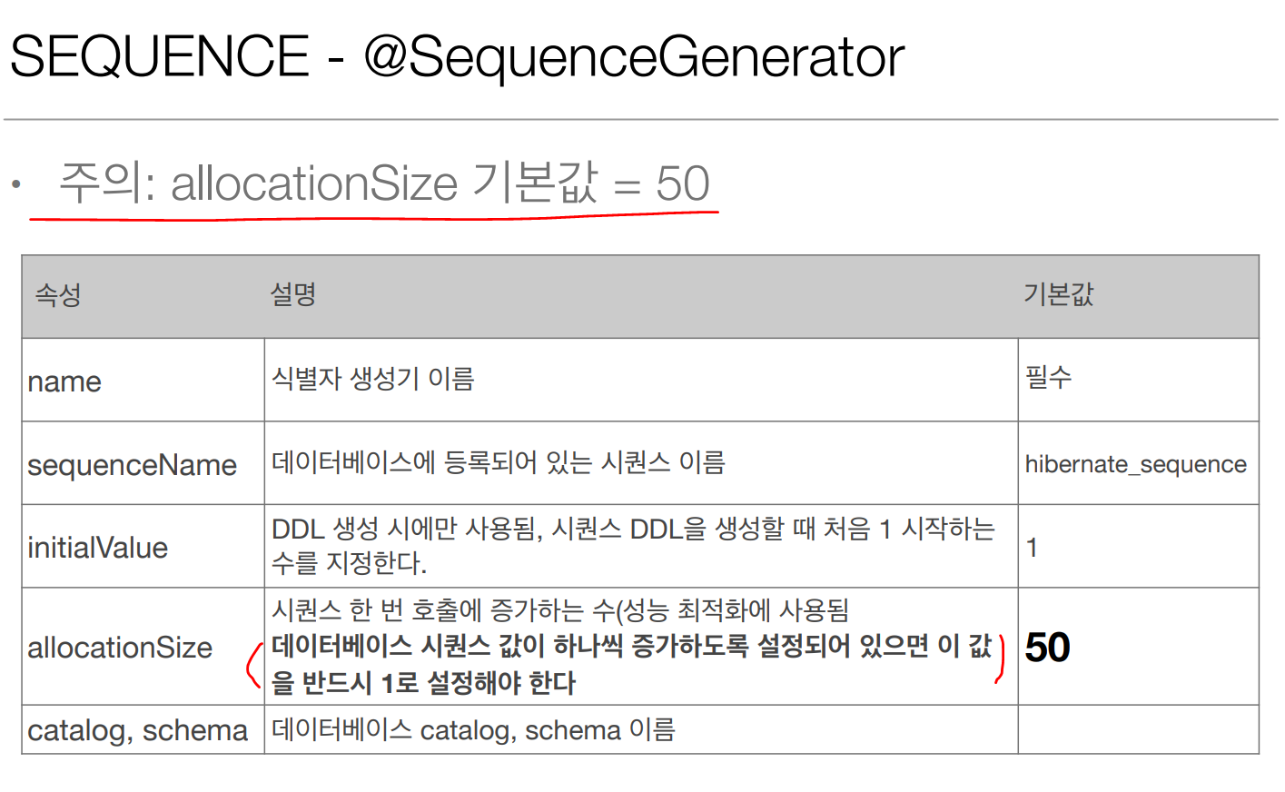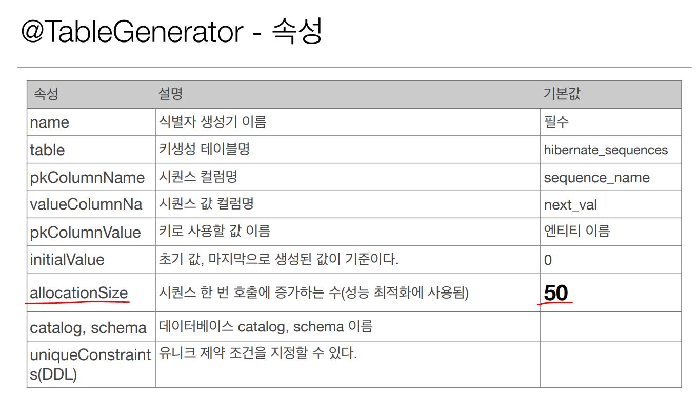( 1~50만큼 미리 DB에 데이터를 생성해주고, 메모리상에서는 pk값이 1~50 넣을수있다는것을 아니까 시퀀스 호출 없이 insert만 진행해주면 된다. DB에 먼저 올려놓고 메모리에서 그 갯수만큼 쓰는 방식)