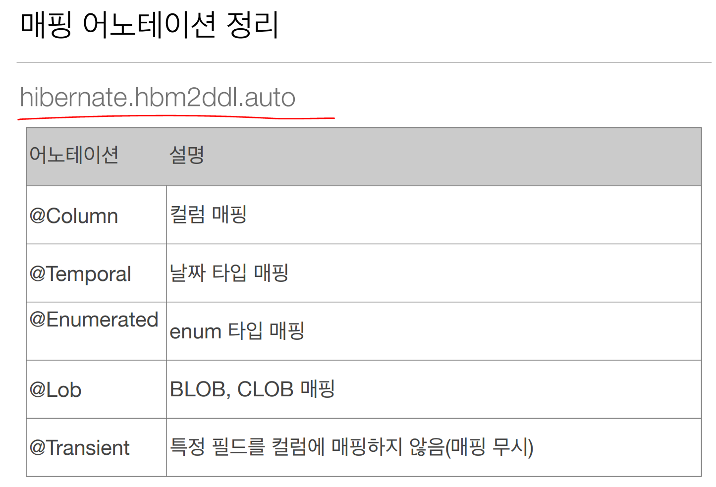 [ 일반적으로 개발할때 테이블을 다 만들어놓고 객체로 돌아가서 개발하지만 jpa는 객체를 만들고 매핑해놓으면 jpa가 ㄷ알아서 어플리케이션이 실행될때 테이블을 다 만든다.]