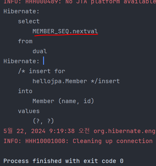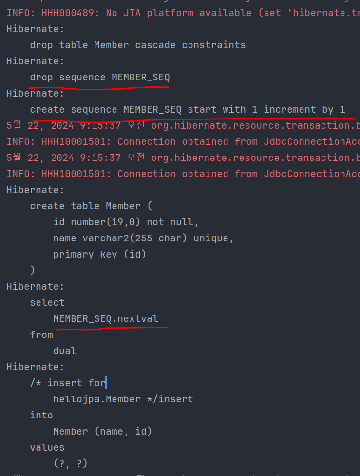 10번의 시퀀스 조회쿼리가 나간뒤 insert 쿼리가 발생한다.