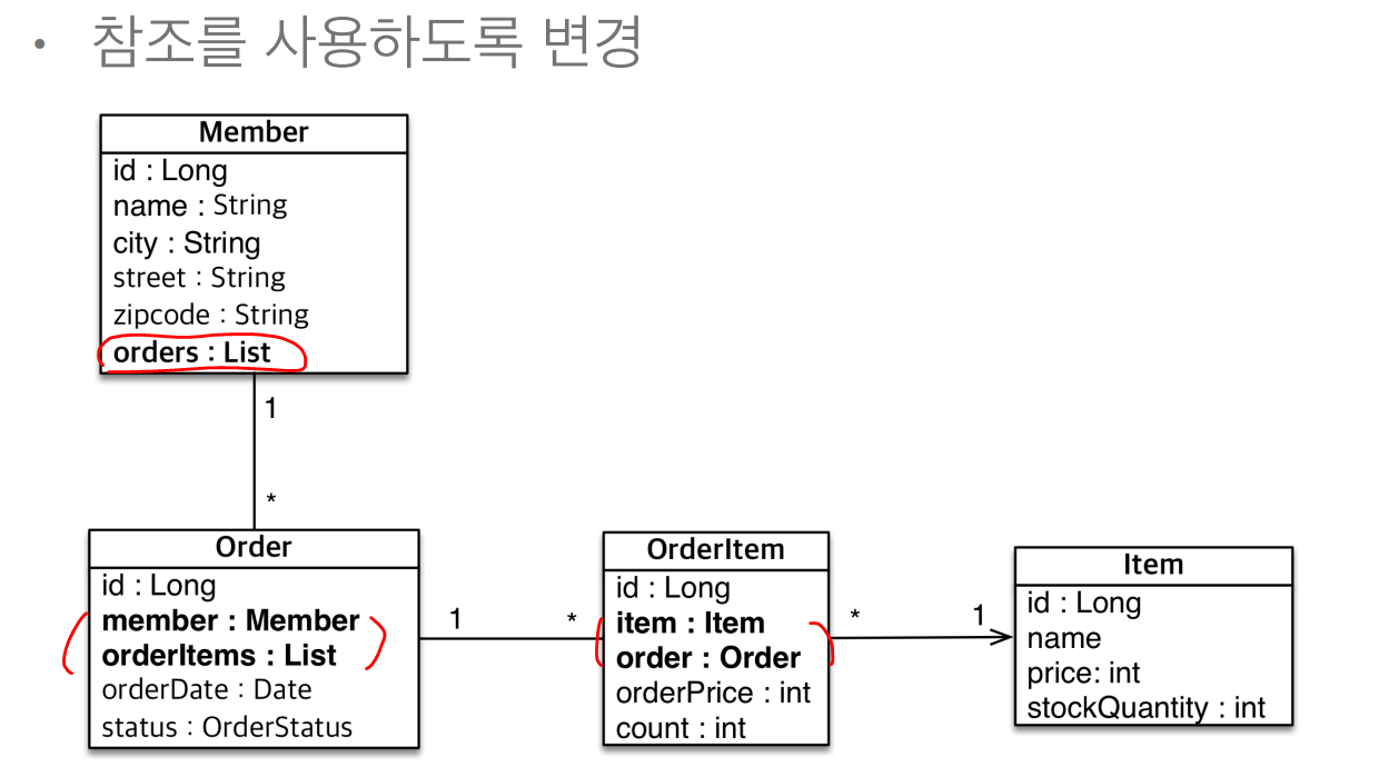 • 참조가 없으므로 UML도 잘못됨 ->이런식으로 구성하면 id만 가지고있고 실제 참조값을 가지고있으므로, 참조가 아니니까 연결이 끊긴 모습으로 다시 그려야한다.