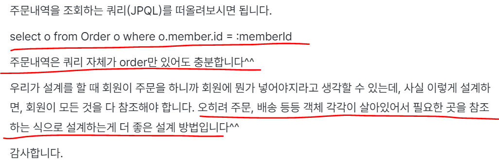예를 들어, ‘내 주문내역’을 확인하기 위해서는 주문 엔티티(Members)에서 직접 해당 정보를 조회하도록 설계하는 것이 더 적합하다. 이 방법은 객체의 역할과 책임을 명확하게 분리하여 유지보수성과 확장성을 높일 수 있게 한다.