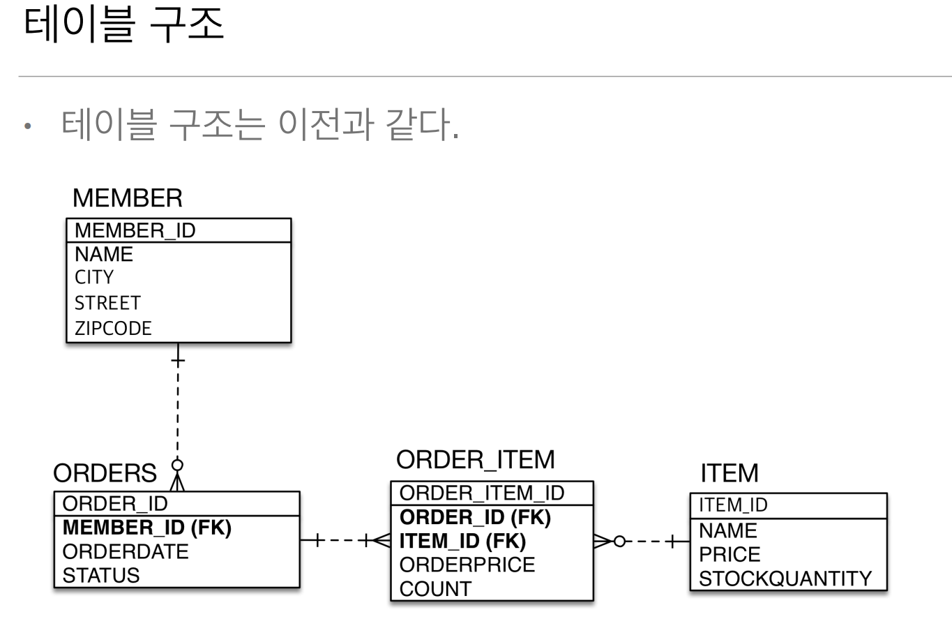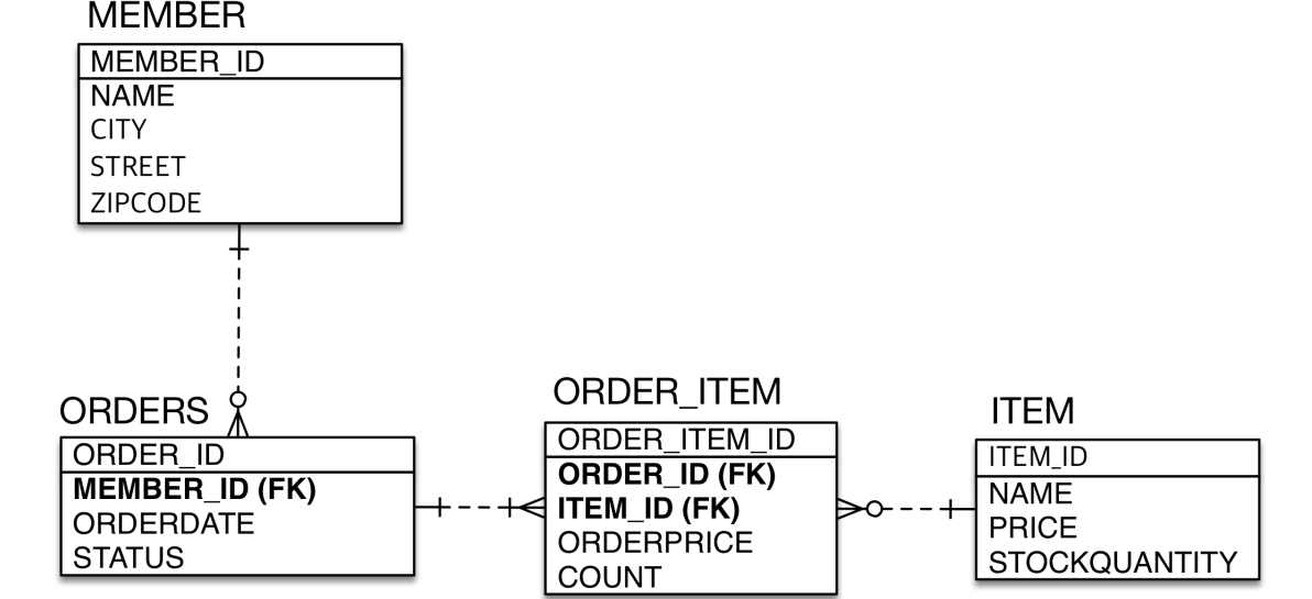 회원과 주문의 관계: 회원은 여러 번 주문할 수 있다. (일대다)