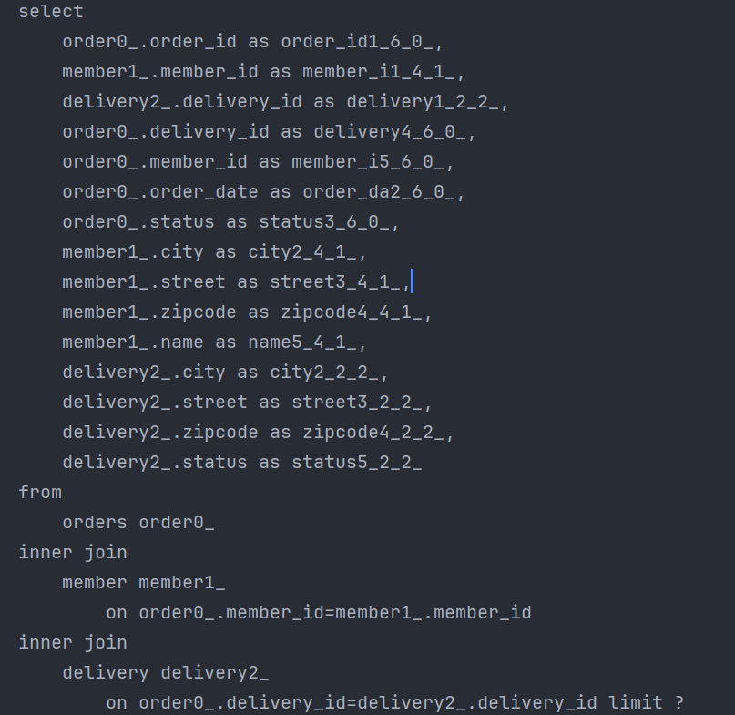 단점 -> 페이징 불가능 [ 일대다 연관관계가 있게끔 조인 sql를 생성하면 페이징 불가능-> 위의 예제에서는 Order와 OrderItem은 일다대 연관관계이므로 둘이 join했을경우 페이징은 불가능하다, 멤버나 딜리버리과 같은 다대일 관계에서는 상관없다. ]