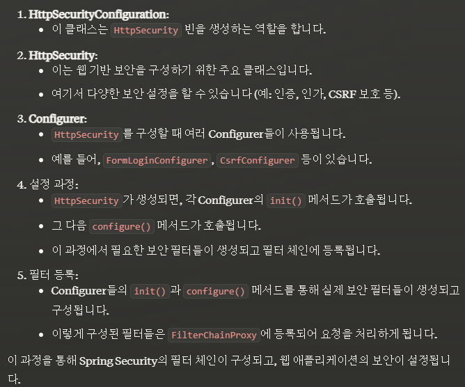 HttpSecurity는 보안에 필요한 각 설정 클래스와 필터들을 생성하고 최종적으로 SecurityFilterChain 빈 생성