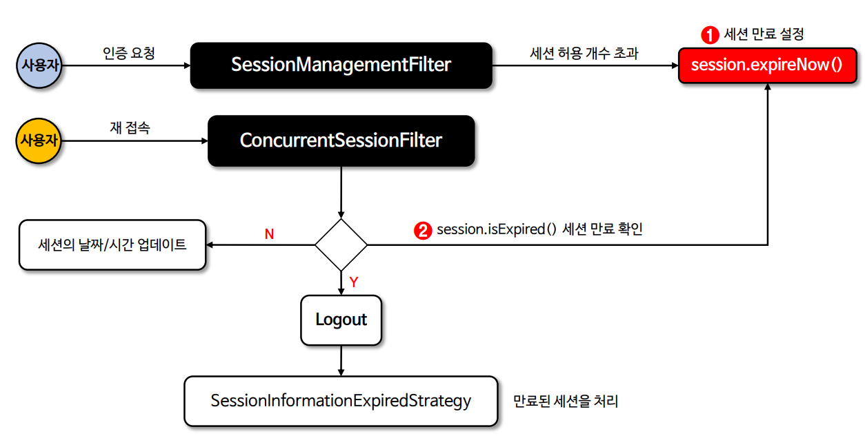 • 각 요청에 대해 SessionRegistry에서 SessionInformation 을 검색하고 세션이 만료로 표시되었는지 확인하고 만료로 표시된 경우 로그아웃 처리를 수행한다(세션 무효화)