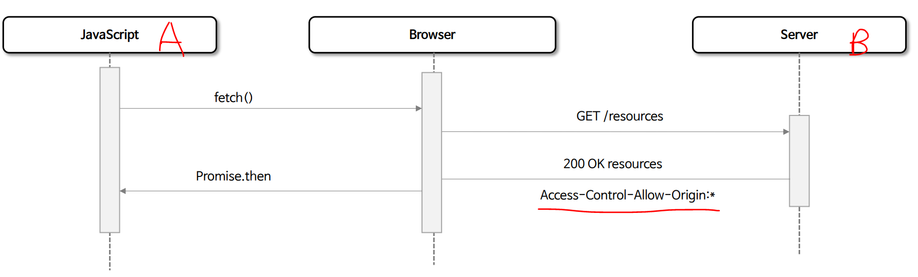 A서비스에서 B서버로 request하면 B 서버가 응답을 보내면서 헤더에 Access-Control-Allow-Origin의 값을 넣어준다.