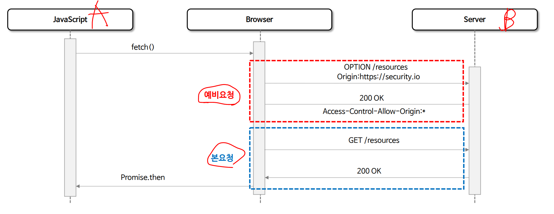 • 예비요청의 역할은 본 요청을 보내기 전에 브라우저 스스로 안전한 요청인지 확인하는 것으로