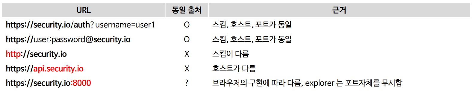 • 두개의 출처를 비교하는 방법은 URL의 구성요소 중 Protocol, Host, Port 이 세가지가 동일한지 확인하면 되고 나머지는 틀려도 상관없다