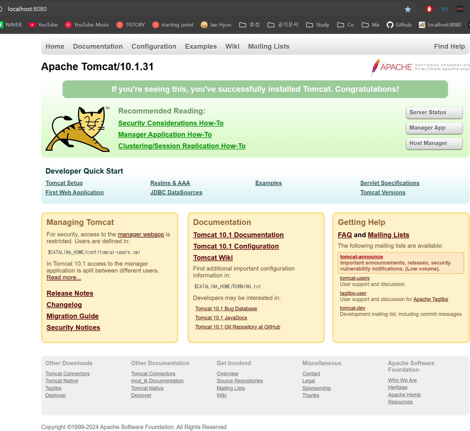 톰캣을 실행하고 localhost:8080 url에 접속해보면 다음과 같은 화면을 확인할 수 있다.