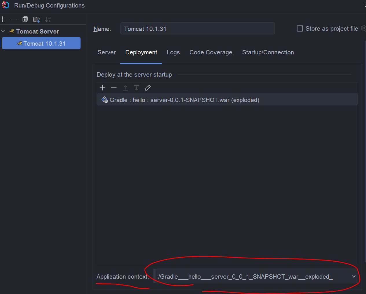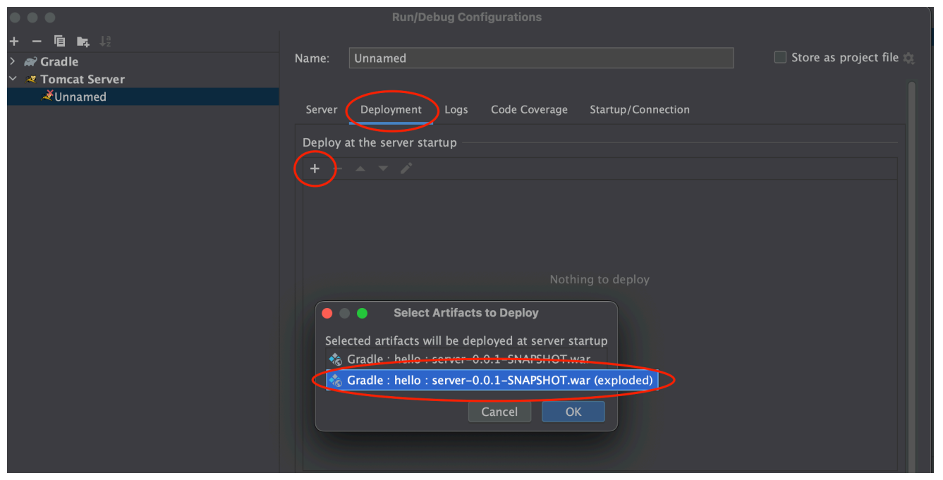 - Application context 박스에 특정 경로가 입력되어 있으면, 그 경로로 웹 애플리케이션이 배포됩니다. 예를 들어 /Gradle__hello__server_0_0_1_SNAPSHOT_war__exploded_와 같은 경로가 입력된 경우, 애플리케이션은 http://localhost:8080/Gradle__hello__server_0_0_1_SNAPSHOT_war__exploded_에서 접근할 수 있습니다.