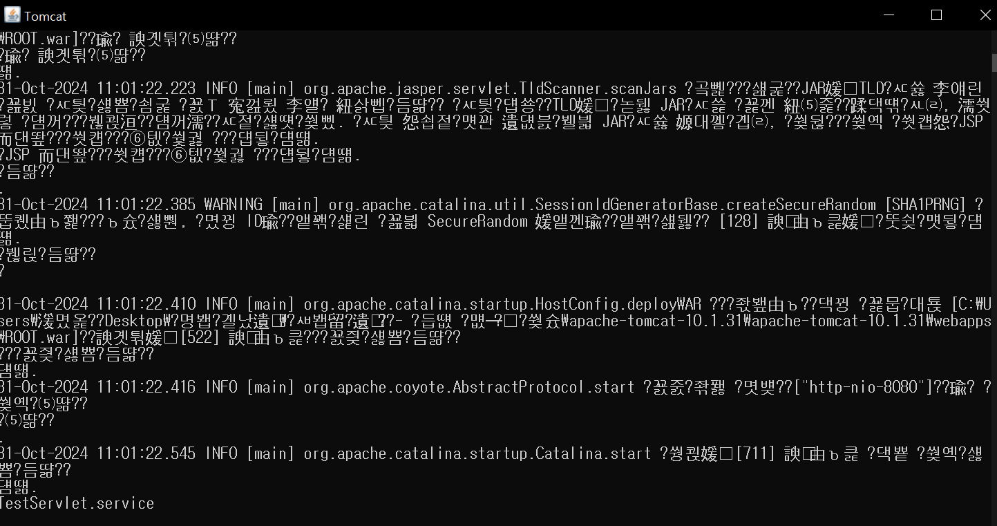 톰캣 실행한 화면인데 한글이 깨지긴하지만