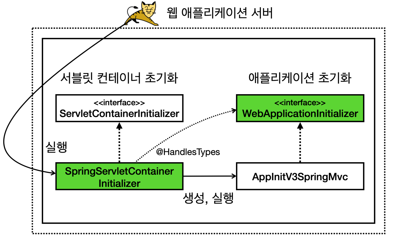 따라서 스프링 MVC를 사용한다면 WebApplicationInitializer 인터페이스만 구현하면 AppInitV3SpringMvc에서 본 것 처럼 편리하게 애플리케이션 초기화를 사용할 수 있다.