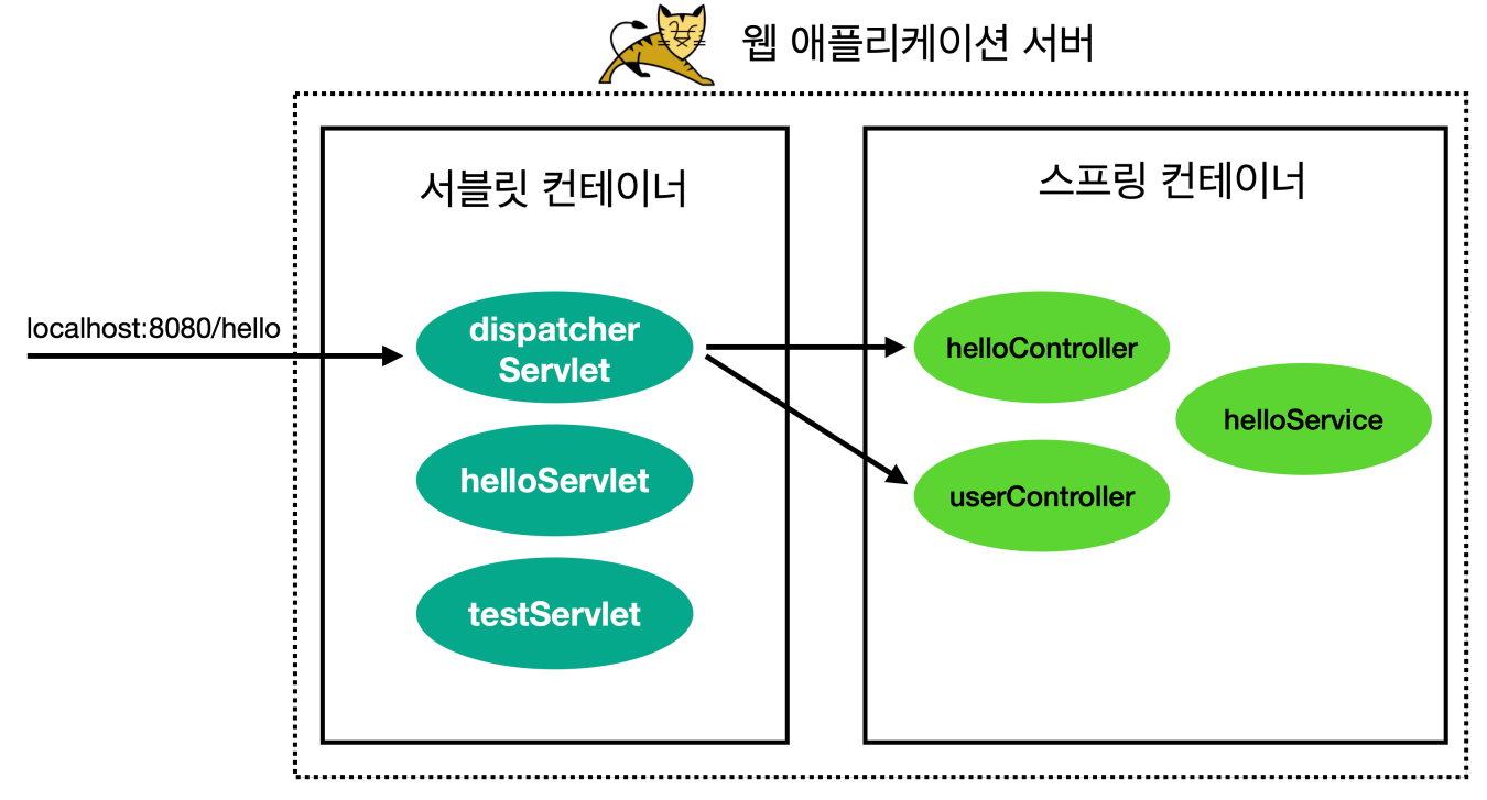 웹 어플리케이션 서버(WAS)안에 서블릿 컨테이너와 스프링 컨테이너가 있고, HTTP Request가 오면