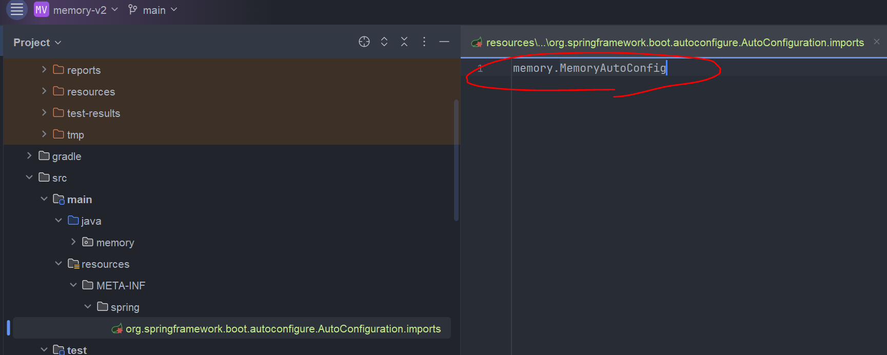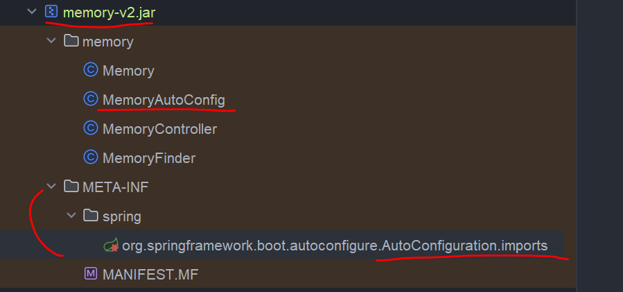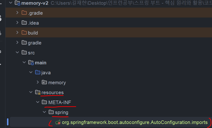 memory-v2 라이브러리의 AutoConfiguration.imports 내용을 불러와서 설정정보로 사용하려는것을 확인할 수 있다.