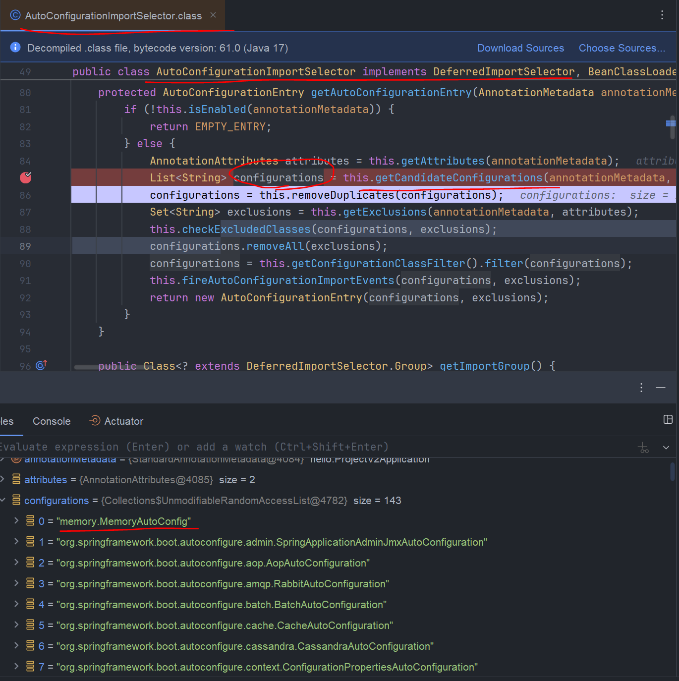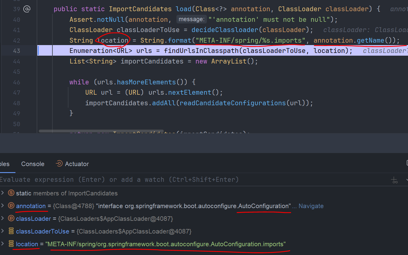 getCandidateConfigurations() 메소드를 따라가보면 load 메소드가 보이고 AutoConfiguration.class를 전달인자로 주고있다.