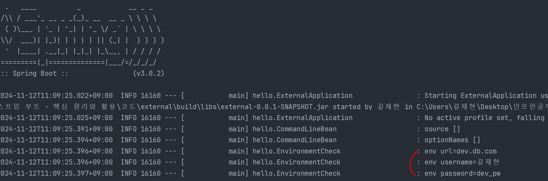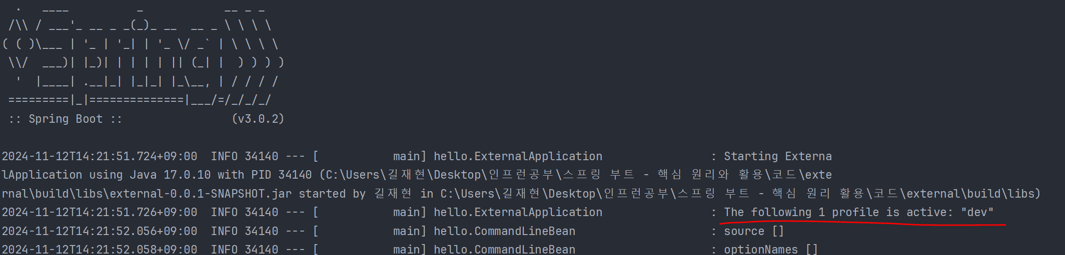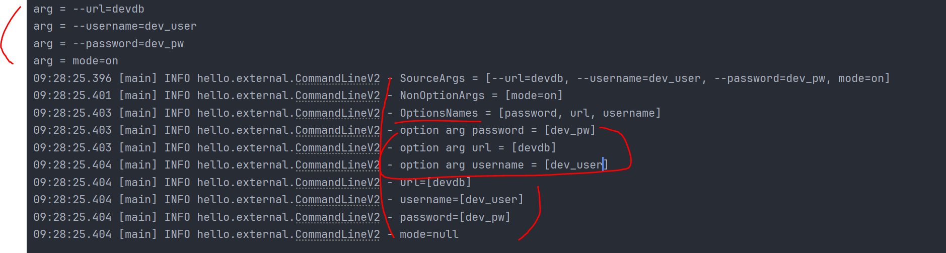 log.info("NonOptionArgs = {}", appArgs.getNonOptionArgs()); // -- [대쉬.옵션]가 안들어간것만 나온다.