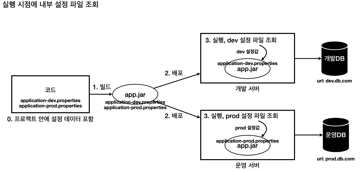 그런데 어디에 있는 외부 설정값을 읽어야 하는지에 따라서 각각 읽는 방법이 다르다는 단점이 있다.